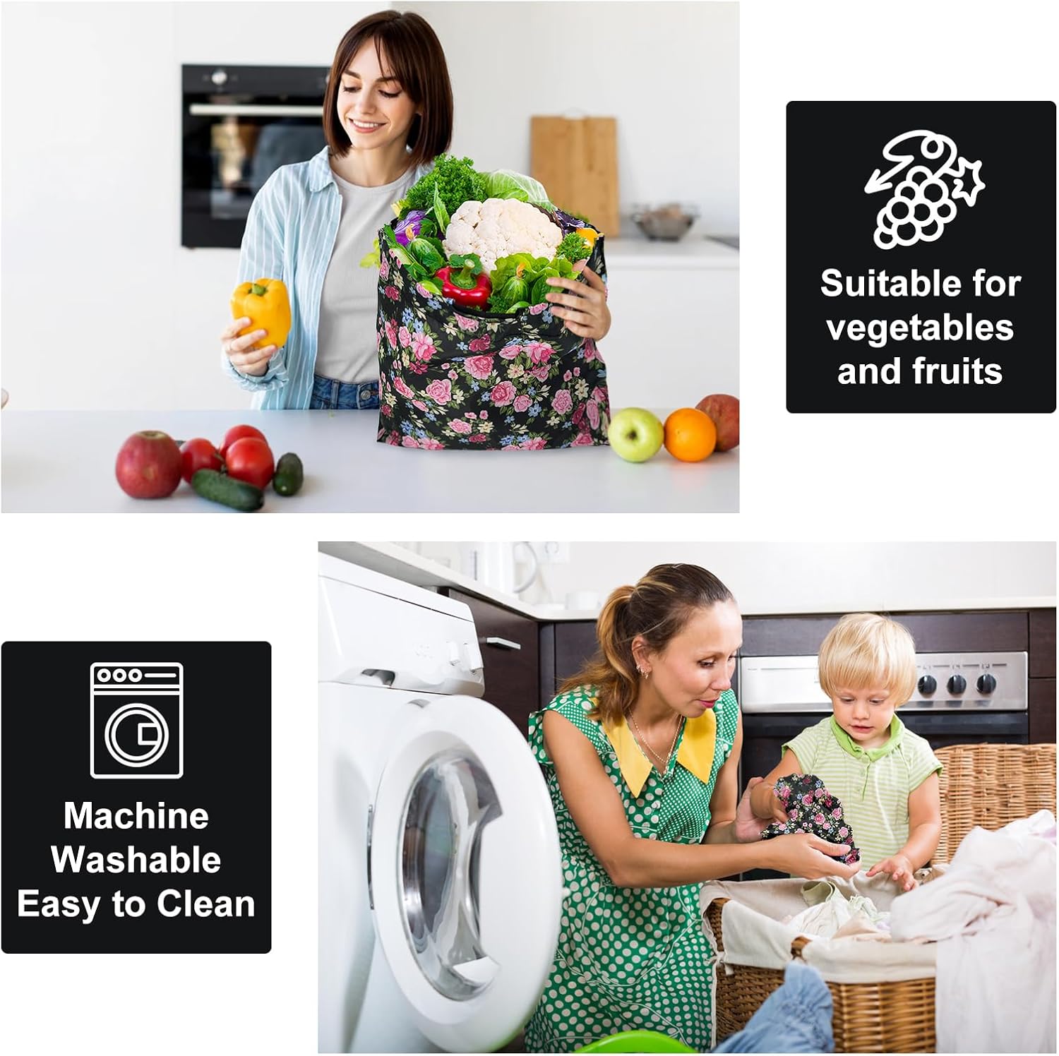 - REUSABLE & MACHINE WASHABLE: Say goodbye to single-use plastic bags! These foldable grocery bags are reusable and can be machine washed. No more worries about sticky messes from items like yogurt, eggs, or meat. Simply toss them in the machine washer for easy cleaning and time-saving