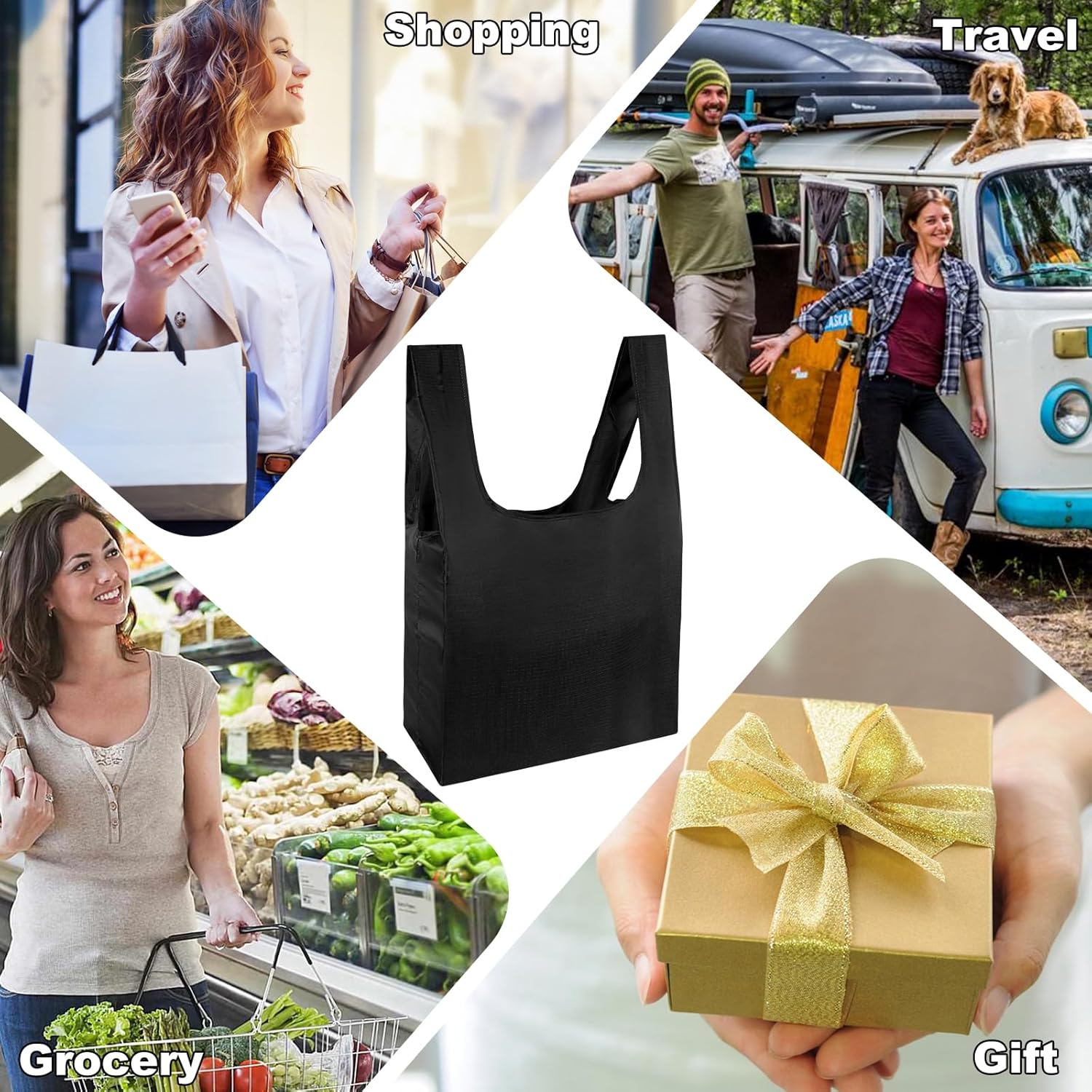 • MULTIPLE USE: The foldable shopping bag comes with long shoulder straps, which allows for hand holding, over arm or over the shoulder toting. It is not only fashionable but also practical. Also, the classic colors make great gifts for holidays. Give these reusable bags to your friends and family to inspire them to use non-plastic bags