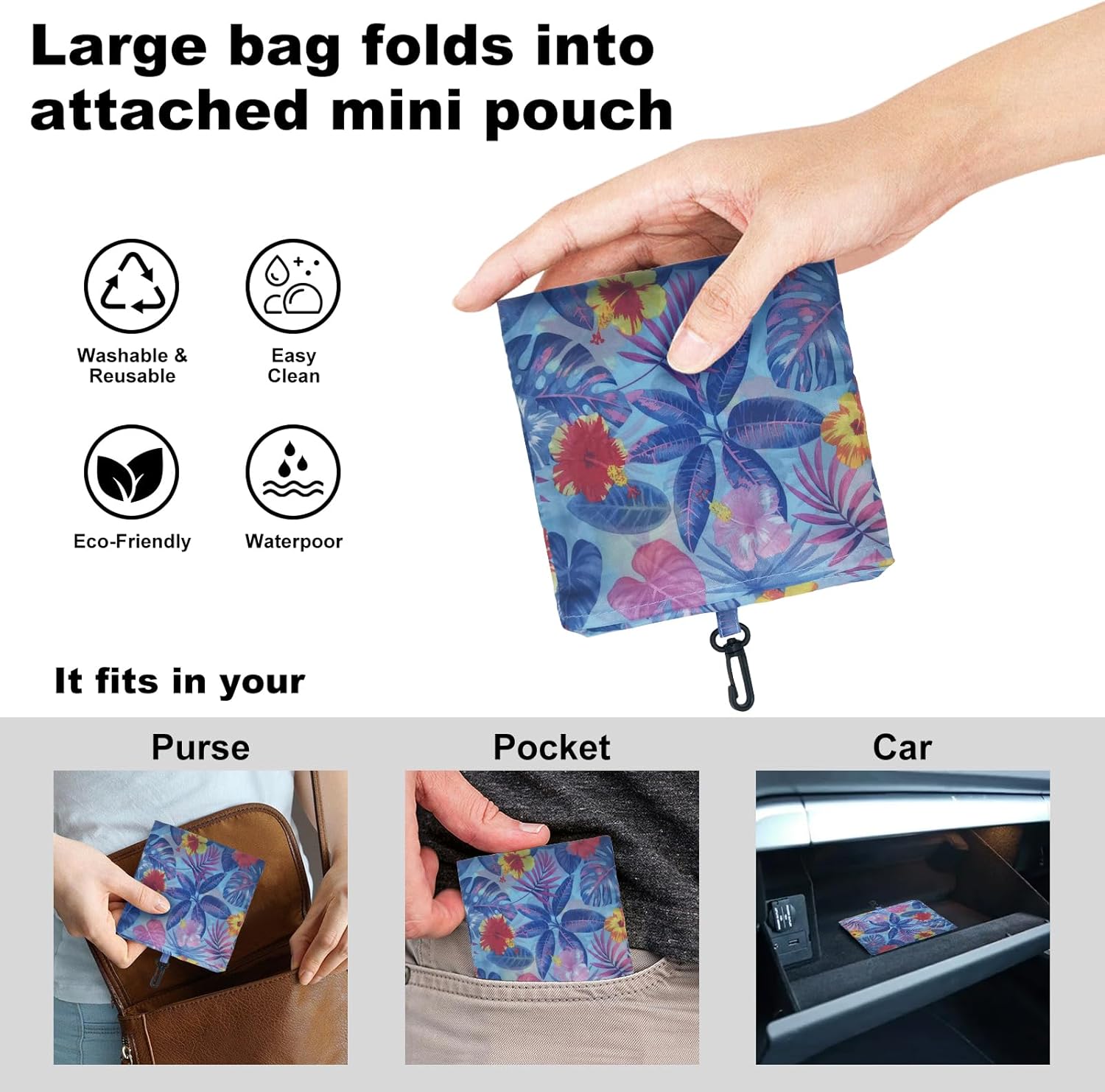 - FOLDABLE & PORTABLE: Our reusable shopping bag can be easily folded into the attached pocket-size pouch You fit in your purse, handbag, backpack or car without taking up too much space. Convenient for anytime use, reducing the need for disposable shopping bags