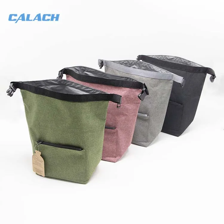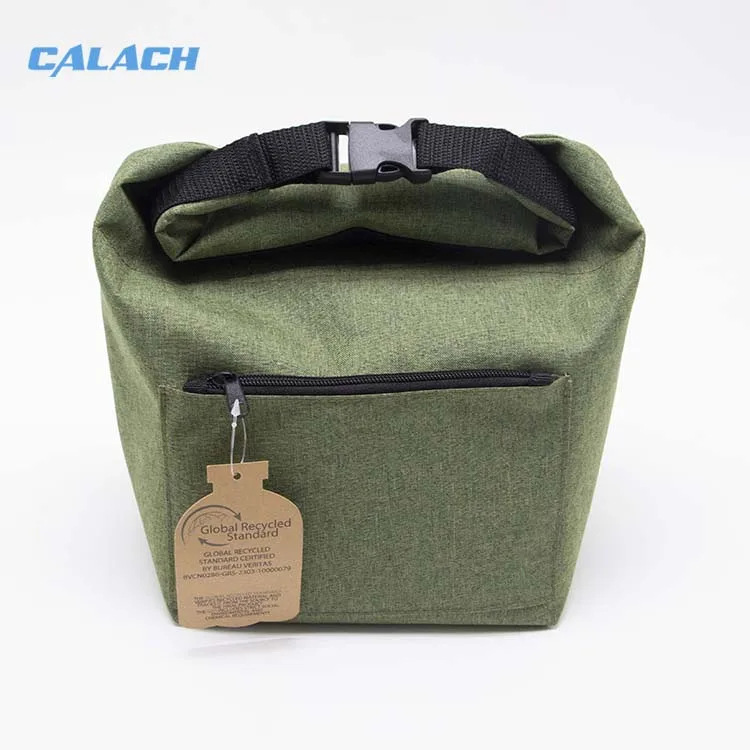 This eco-conscious roll-top lunch bag features a sleek green polyester exterior with minimalist styling. Its signature roll-top closure provides adjustable capacity, while the front zippered pocket offers organized storage for utensils or small accessories.