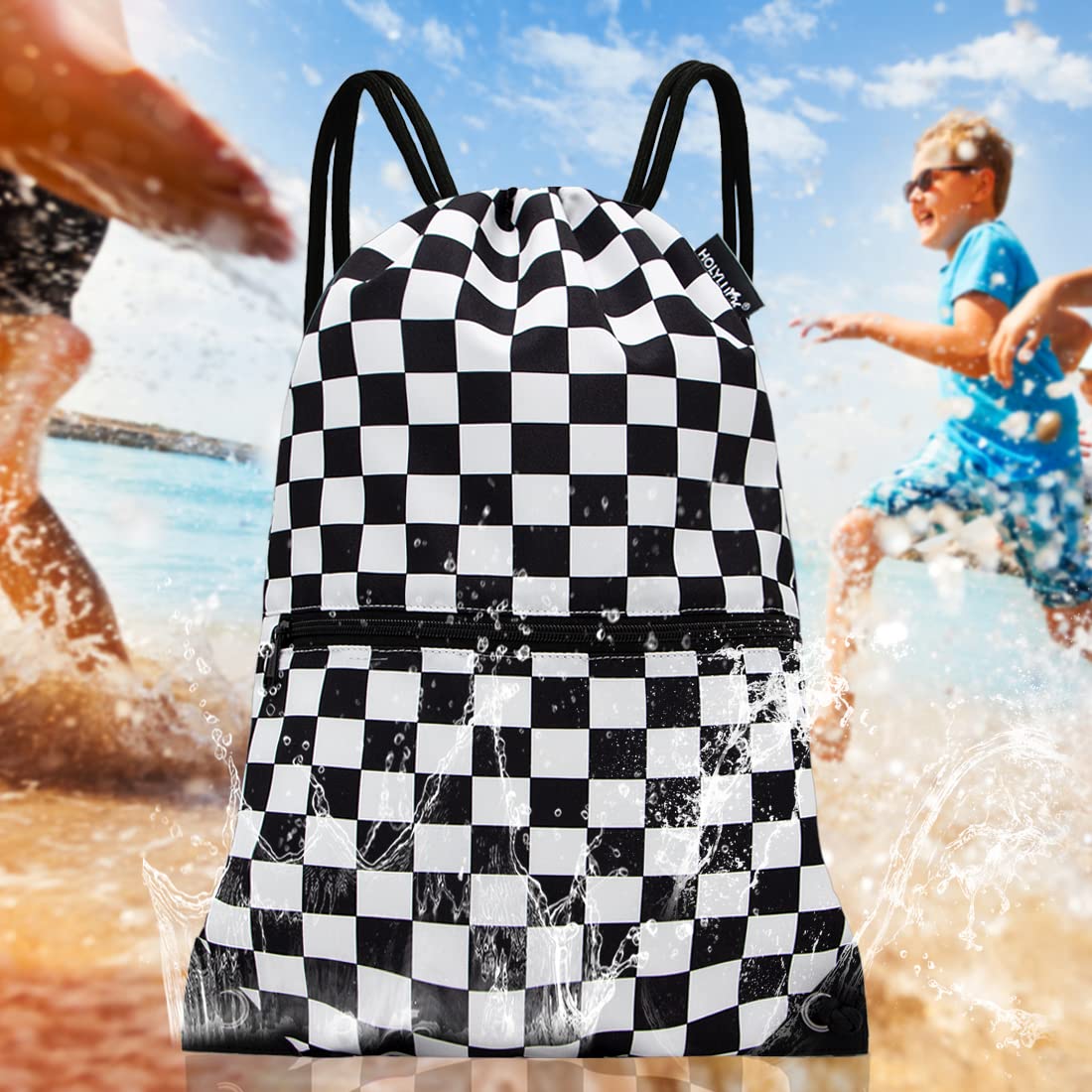 Drawstring Backpack Bag Sport Gym Sackpack Black and White Grid HLC001