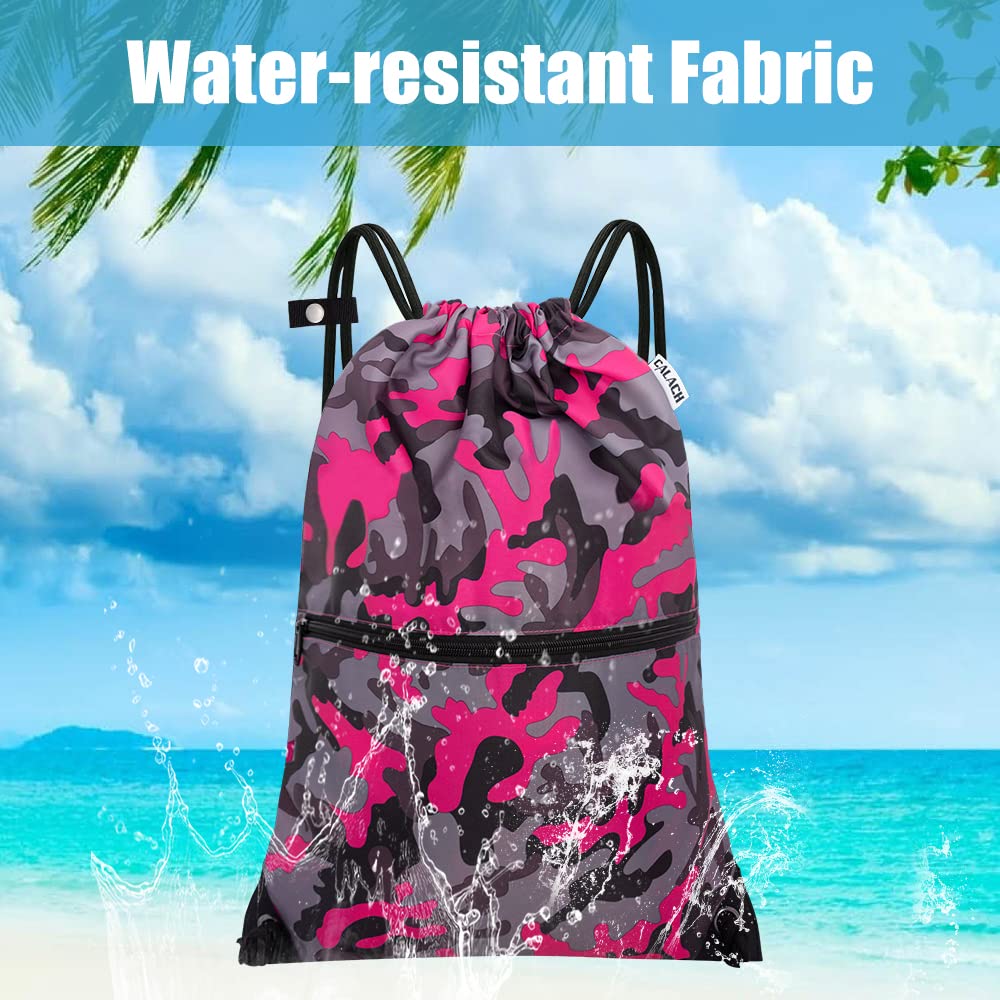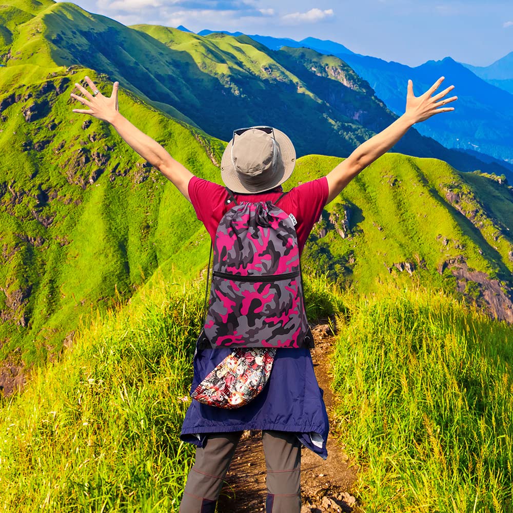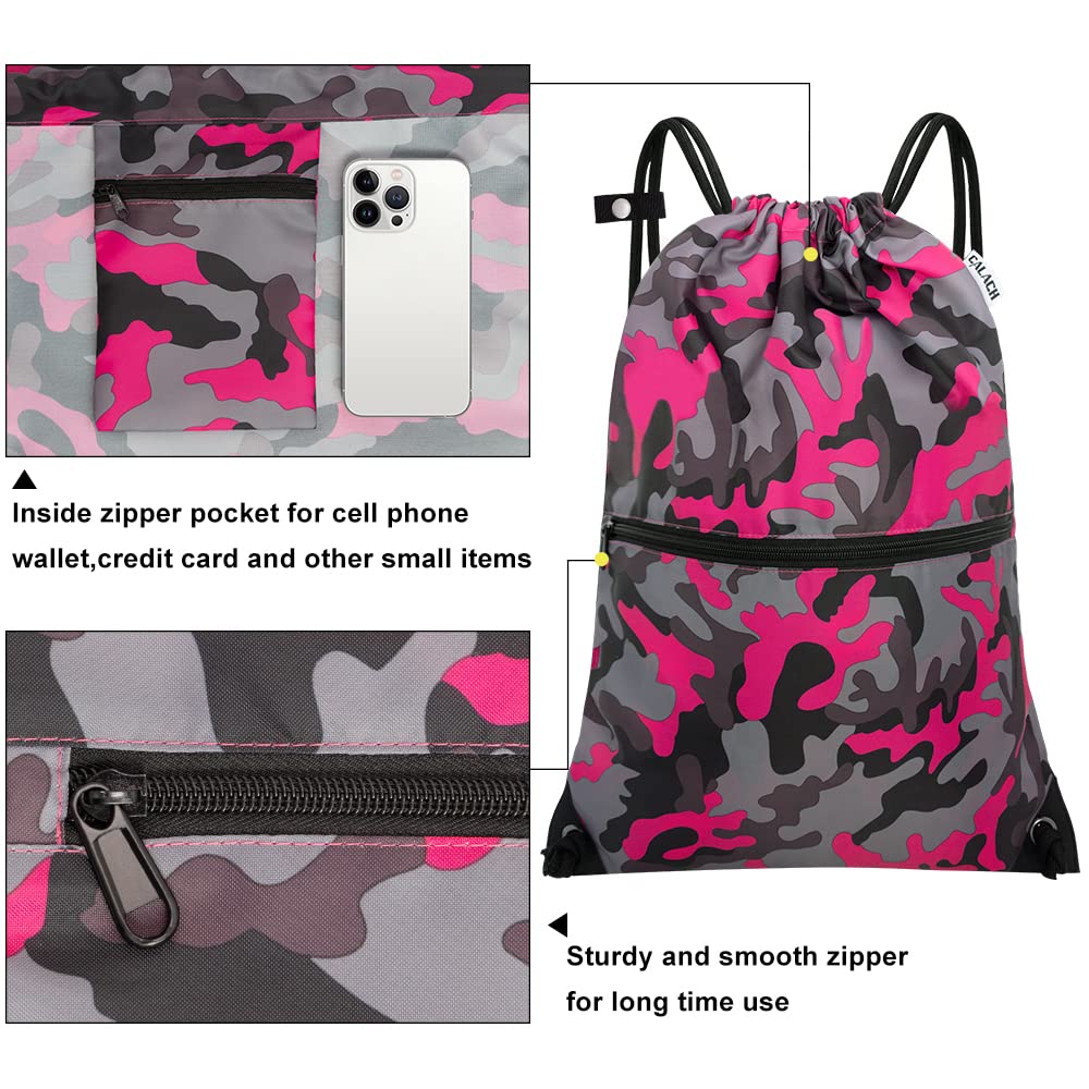- ENHANCED DURABILITY & COMFORT: CALACH Drawstring Backpack for gym is made of 100% Polyester fiber which is recyclable, water resistant, and durable, withstands daily wear and tear. Drawstring closure makes you store things quickly and take them in and out easily. Thicker drawstrings prevent from digging into your shoulders and help reduce your shoulder burden