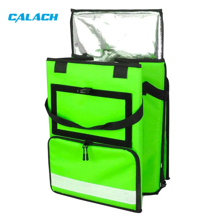 This is a premium food delivery bag featuring high quality exterior with reflective safety strips. Its interior is fully insulated to maintain optimal food temperatures during transit. The spacious main compartment includes internal straps to secure containers, while the wide-opening front flap and sturdy handles ensure easy access and comfortable carrying.
