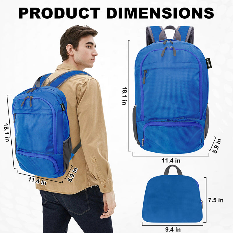 • Large Capacity: Size: 18*11.5*6inch(L*W*H), 20L storage space. The foldable backpack features three zippered compartments. The main pocket is Large enough to hold ipad and clothes. Outer smaller pockets are great for quick access such as tissue and keys. Two mesh side pockets for water bottles or umbrella.