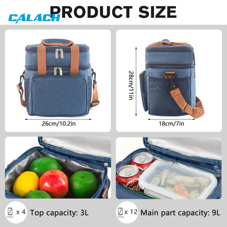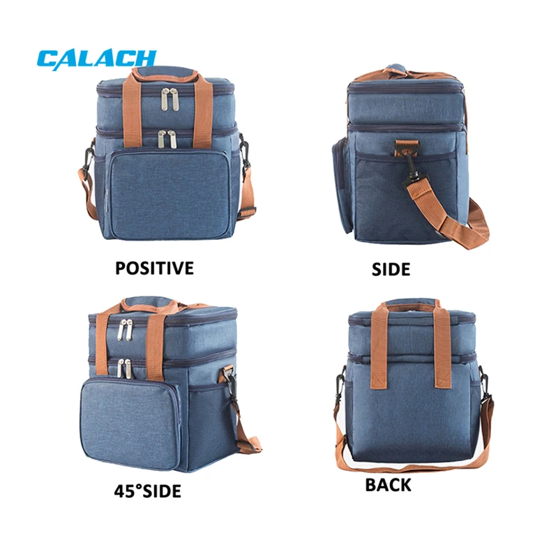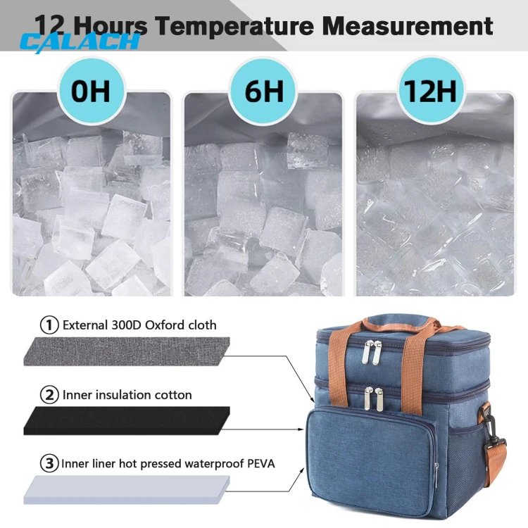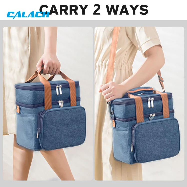 This stylish and functional lunch bag features a durable, soft-textured blue fabric exterior for a casual yet trendy look. Its innovative double-layer compartment design provides organized storage - a top section for fruits or snacks and a spacious bottom section for larger meal containers. The interior is lined with heat-insulating material PEVA to maintain food freshness and temperature, while sturdy brown handles ensure comfortable and easy carrying.