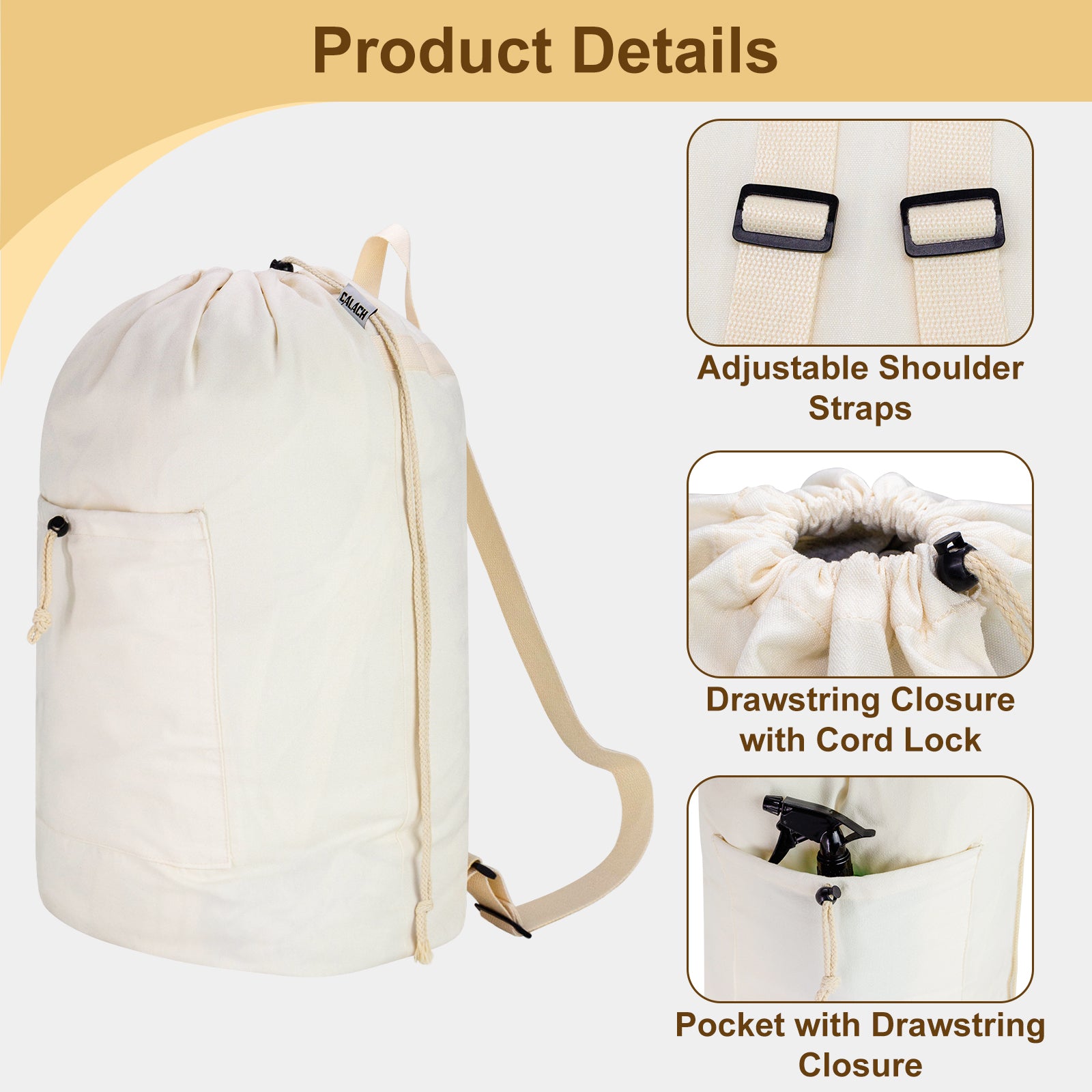 • Multi-Use Canvas Storage Bag- This sturdy canvas bag can be use as a nice travel laundry bag, camping laundry bag, college laundry bag, dirty clothes bag, hamper bag, travel hamper, grocery backpack, cargo bag, or a storage bag