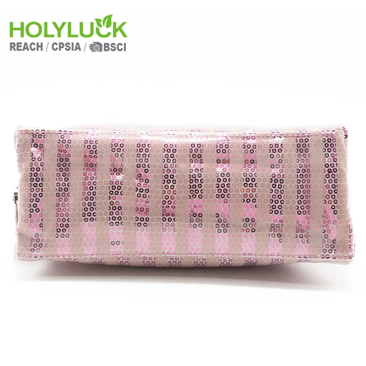 • Professional Lady Series Victoria Posh pink Bling Sequin Zip Striped Pvc Custom logo Makeup Organizer Cosmetic Bags for Travel