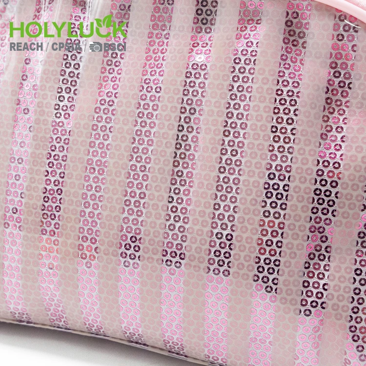 Professional Lady Series Victoria Posh pink Bling Sequin Zip Striped Pvc Custom logo Makeup Organizer Cosmetic Bags for Travel